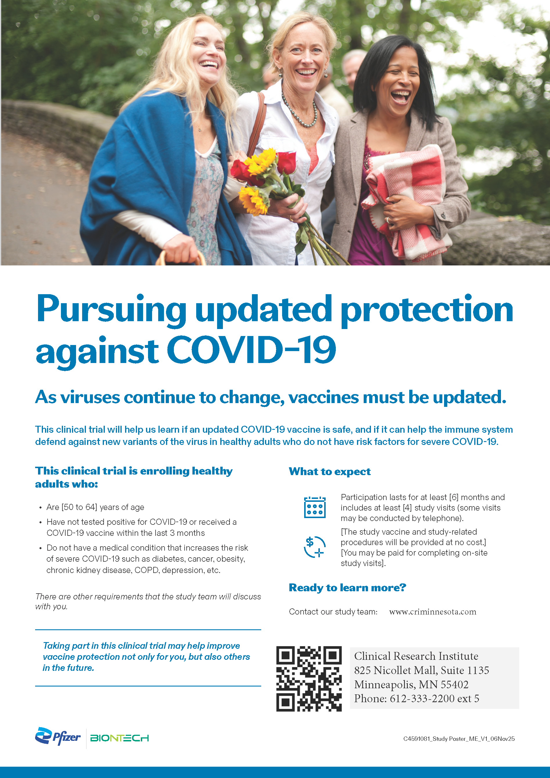 Whether you are a healthy volunteer or have a specific condition, you can make an impact by participating in one of our clinical studies. Learn more about the actively enrolling studies you may be eligible for.